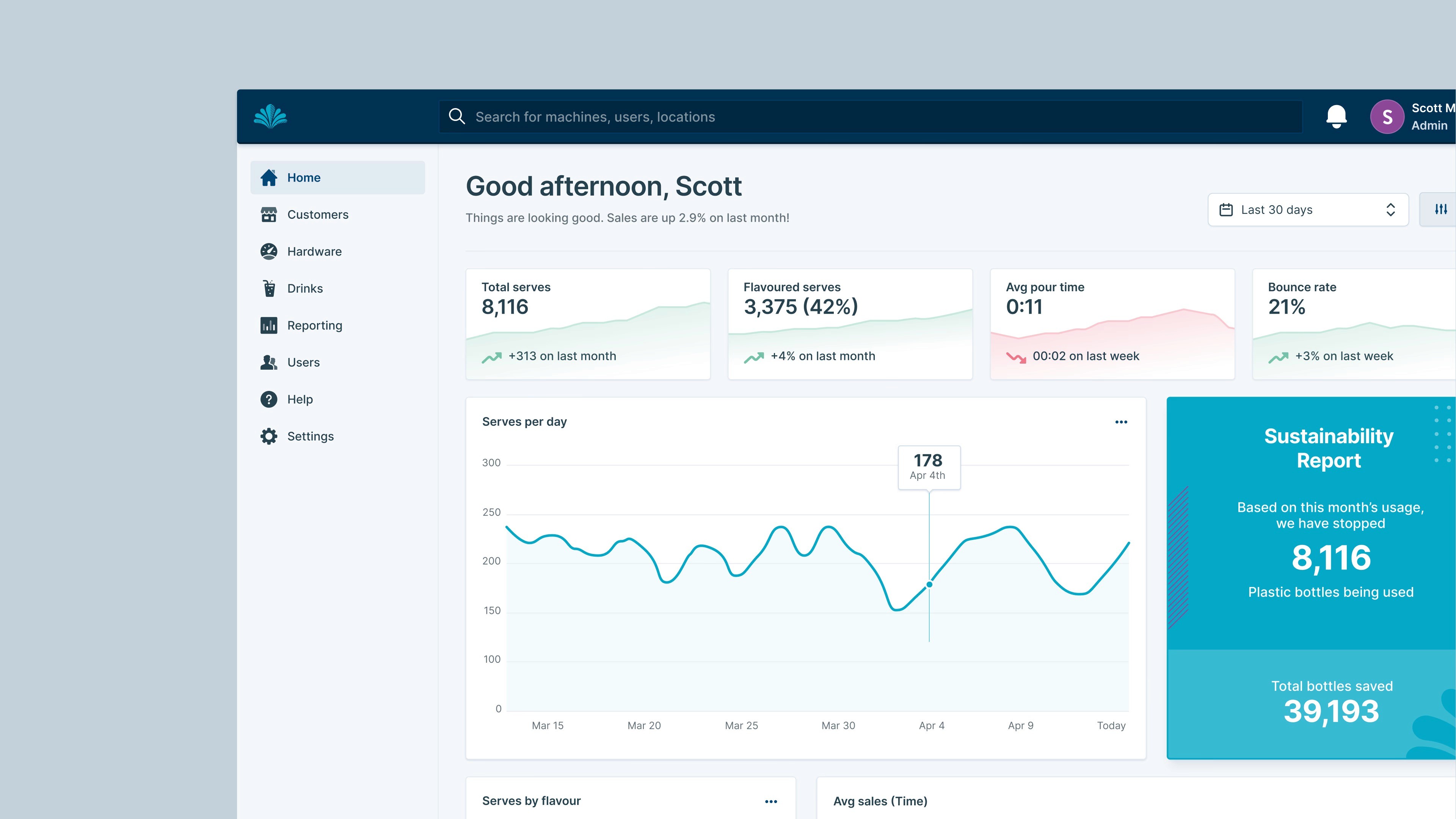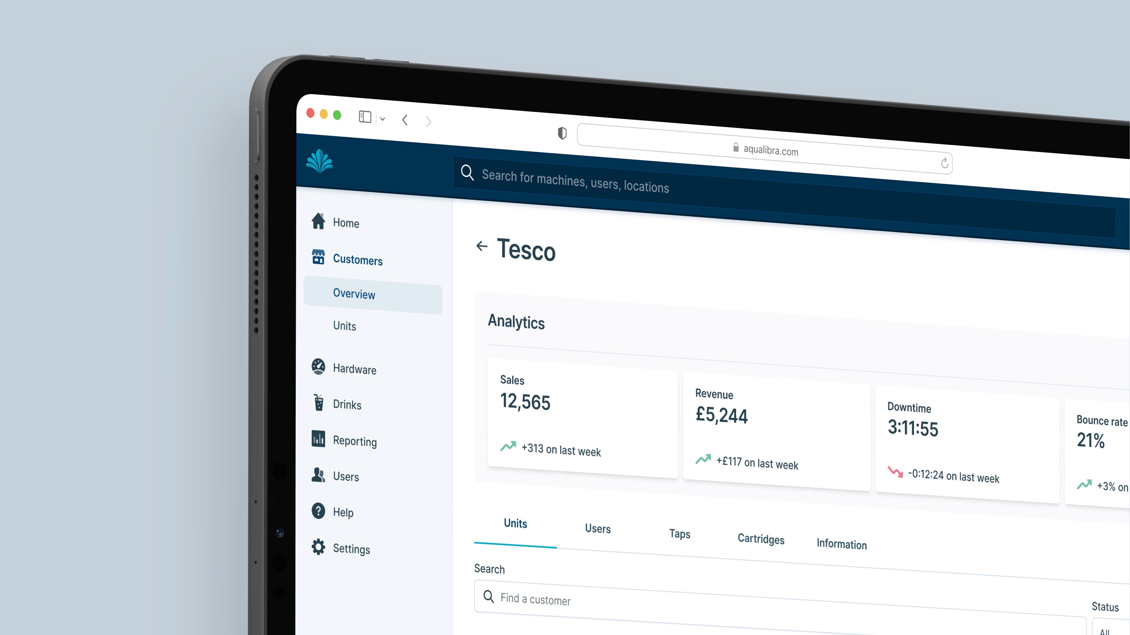 Alongside the tap interface, the team designed a fully responsive back office portal tailored for both Britvic’s internal teams and their enterprise clients. The system allows users to view usage data, track cartridge status, monitor carbon savings and manage billing. Real time survey feedback, behavioural analytics and light touch marketing tools were also integrated to support ongoing improvement. The design focused on modularity and clarity, ensuring the system could evolve with the product and scale across different environments from corporate offices to university campuses and beyond.